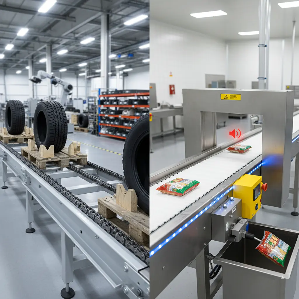 Unsere Metalldetektor-Förderbänder sind für die präzise Identifizierung und Ausscheidung von metallischen Verunreinigungen konzipiert. Ohne den Produktionsfluss zu unterbrechen, gewährleisten sie die Sicherheit Ihrer Endprodukte in Branchen wie Lebensmittel, Pharma und Recycling. Fremdkörper wie Nägel, Nadeln oder Metallsplitter werden zuverlässig erkannt – sowohl in Schüttgut als auch in verpackten Produkten.