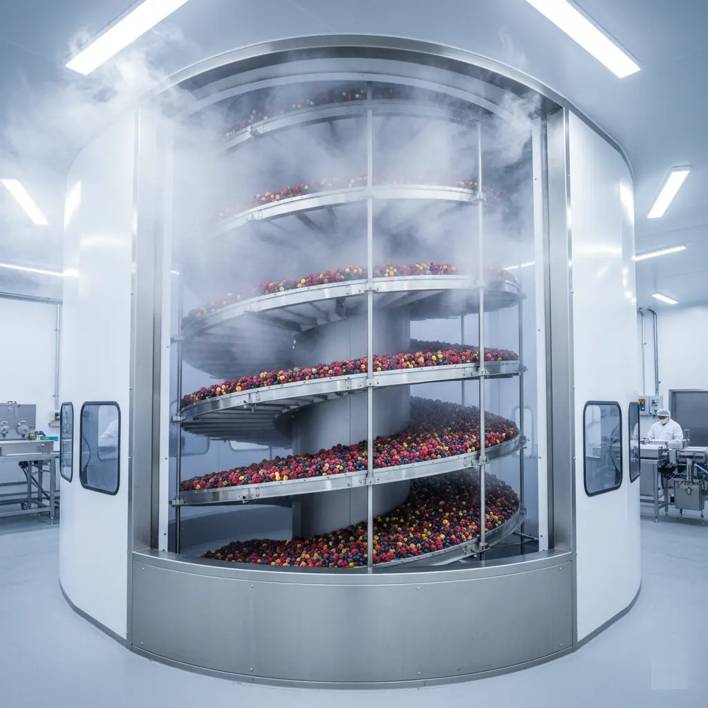 Diese Systeme sind essenziell für IQF-Schockfrostungsanlagen und Kühlprozesse, insbesondere bei Fleisch- und Backwaren. Sie ermöglichen ein effizientes und gleichmäßiges Abkühlen oder Schockfrosten von Produkten wie Brotvariationen direkt nach dem Ofen oder Fleischprodukten vor der Verpackung.